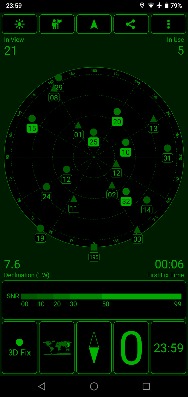 捕捉している人工衛星の数、測位に利用している人工衛星の数、また衛星からの信号の強さなどが一目瞭然にわかります。